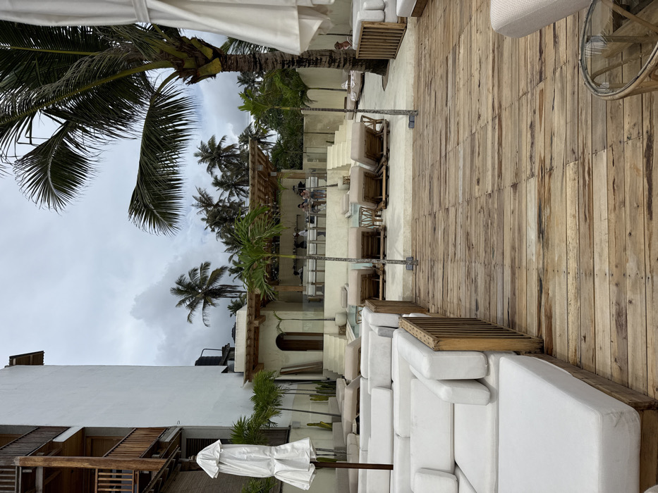 An outdoor lounge area features cushioned seating, light wooden decking, and palm trees. A building with a white exterior and arched doorway is visible in the background. People are seated at tables on a patio. The sky is overcast, suggesting a cloudy day. An umbrella and additional seating are in the foreground. The scene evokes a tropical or coastal setting.