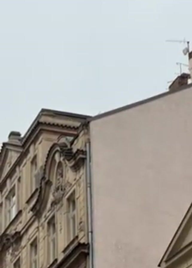 The camera pans upward from the facade of an ornate building with multiple windows toward the sky