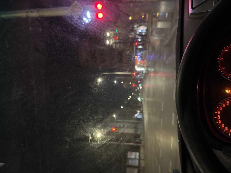 The image presents a nighttime view of an urban intersection in Sofia, Bulgaria, observed from the driver's seat of a stationary vehicle. The perspective is through a smudged and wet windshield, causing light sources to appear diffused. In the foreground, the upper portion of a steering wheel is visible at the bottom center. Below it, the vehicle's dashboard instrument cluster displays illuminated red gauges, including a speedometer indicating zero (0) km/h, and a yellow warning light on the right side. The street ahead is wet and reflective, indicating recent rain or precipitation. White dashed lane markings are visible on the asphalt. Multiple traffic lights are present, with prominently illuminated red signals indicating a stop for the observer's vehicle. Two red traffic lights are clearly visible on the right side of the road, and another red light is on the left. Further down the street, blurred streetlights and distant traffic signals show various colors, including white, yellow, green, and blue. Buildings line both sides of the street. On the right, some ground-floor establishments feature illuminated signs, including one distinct blue and one reddish glow. The buildings on the left appear darker, with some indistinct advertising boards or panels along the sidewalk. Numerous streetlights provide artificial illumination to the environment. No discernible pedestrians or other vehicles are clearly visible within the frame.