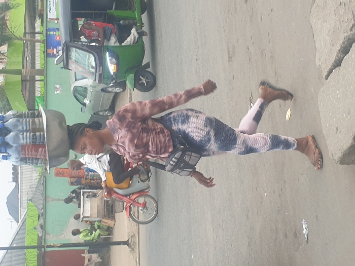 An adult female walks on a paved road in Umuode, Nigeria, carrying a silver metal basin containing at least seven plastic bottles on her head
