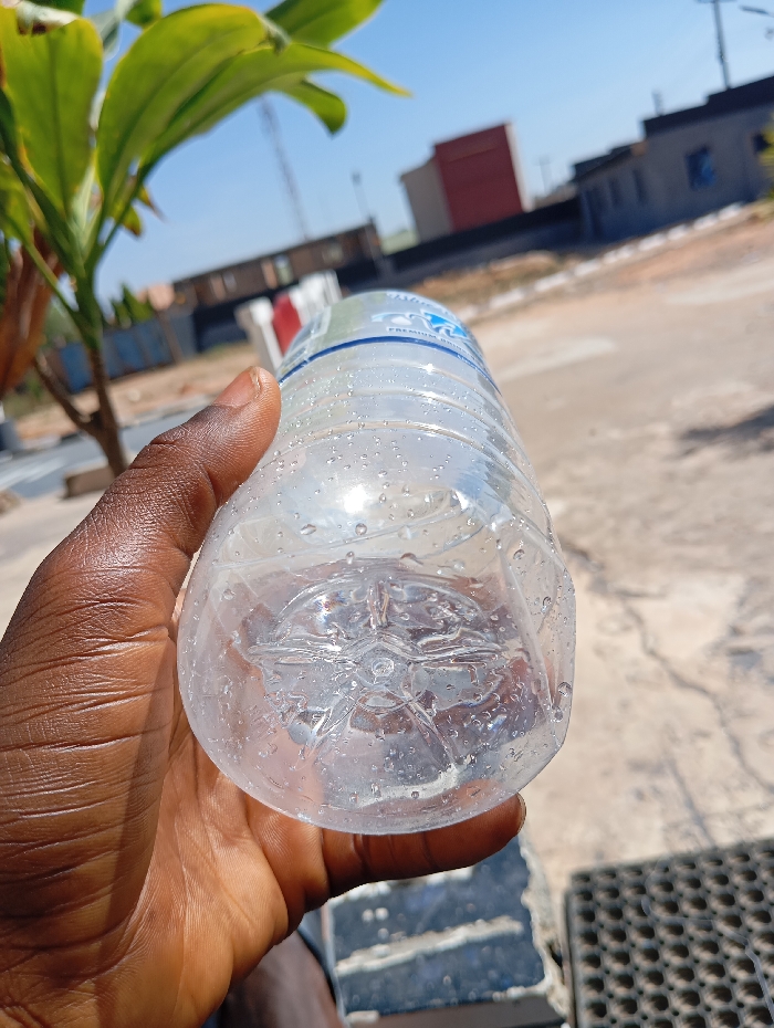 A dark-skinned right hand is centrally positioned, holding a clear plastic water bottle