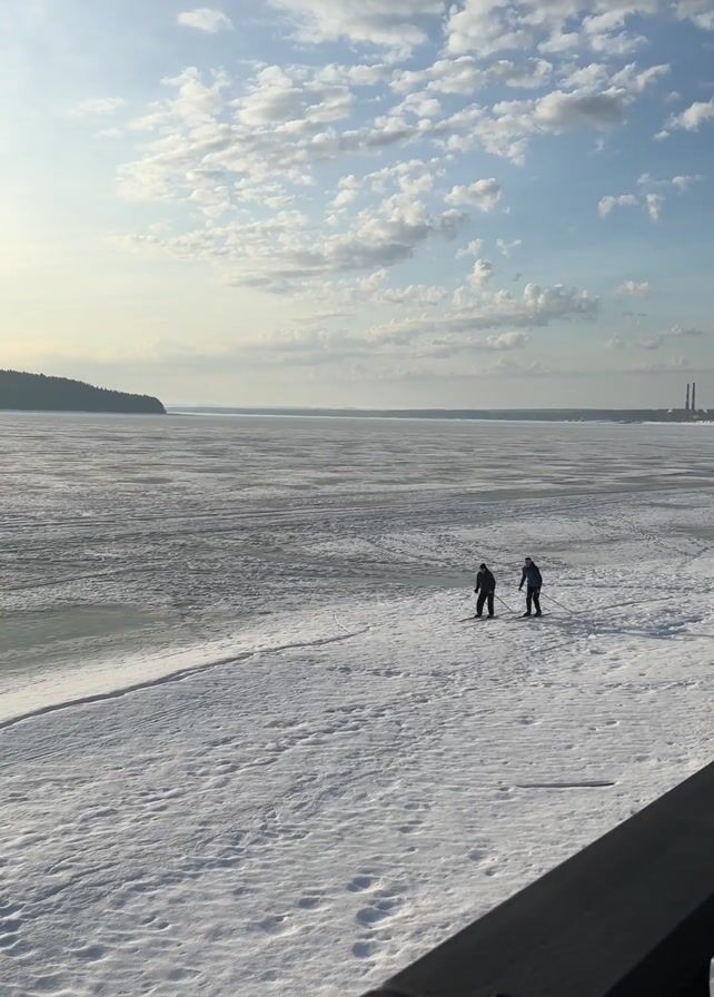 Two people are cross-country skiing on a vast, flat expanse of snow and ice, under a partially cloudy blue sky. A strip of trees is visible in the distance. In the far right, smokestacks are visible. The shot is taken from an elevated position, with a railing visible in the lower right.