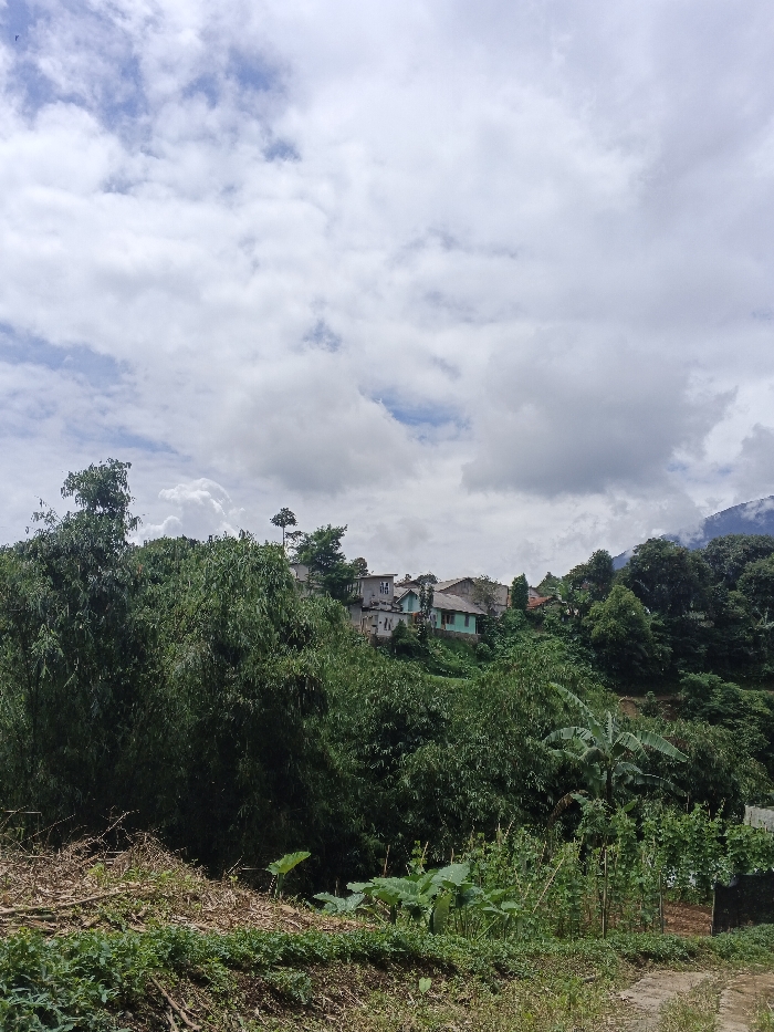 Lush green foliage covers a hillside under a cloudy sky. Houses perch among the trees, partially obscured by dense vegetation. A cultivated plot is in the foreground, featuring leafy plants and patches of bare earth. The scene suggests a rural, possibly mountainous, landscape.