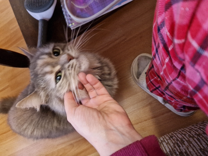 This image depicts an indoor scene within the city of Lovech, Bulgaria, featuring a human interacting with a domestic cat. A medium-haired, grey tabby cat with green eyes and prominent whiskers is positioned on a light wooden floor, looking towards the viewer. A human's left hand, clad in a maroon sleeve, is gently stroking the cat's cheek and chin area. In the foreground, the human's left leg, dressed in red and black plaid pajama pants and a light-colored slipper, rests on the same wooden floor. In the background, partially visible, are a dark furniture leg, a grey and white pet grooming brush with a black head, and a multi-colored object resembling a book or magazine. The scene captures a moment of affectionate interaction between the human and the cat.