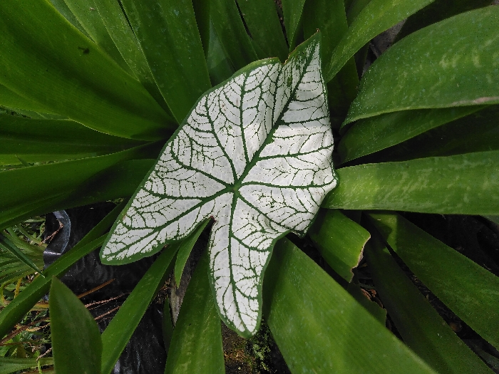 The image displays a close-up, top-down view of a single variegated plant leaf centered amidst dense green foliage. The prominent leaf, identifiable as a Caladium, is broad and heart-shaped, featuring a bright white lamina intricately patterned with a dense network of dark green veins. The leaf margins are also dark green. Surrounding and beneath this central leaf are multiple long, deep green, strap-like leaves of a different plant, arranged in an overlapping pattern. A segment of a black plastic nursery pot is partially visible in the upper left background, obscured by foliage. The scene is located in Altamira, Mexico, and depicts an outdoor cultivated environment under natural, diffused lighting. No people, actions, or interactions are present.