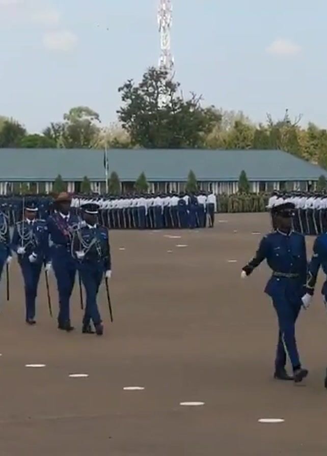 A group of people dressed in blue military uniforms are marching in formation across a paved area marked with dotted lines. The group is divided into rows, with each row marching in unison. Most of the individuals are carrying rifles, which they hold at shoulder height. In the background, there is a row of people in white uniforms, and a large building with a blue roof and trees. A tall communication tower stands further behind the building. The sky is partly cloudy. The group appears to be participating in a military parade or ceremony.