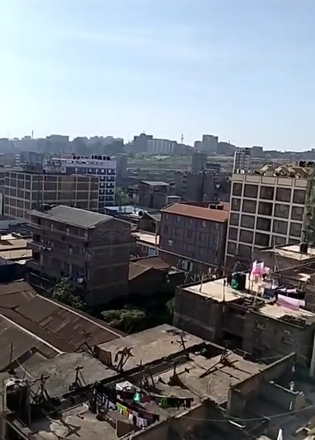 daytime, outdoor shot of a cityscape, possibly in a developing country. The view is taken from an elevated position, overlooking numerous buildings of varying heights and architectural styles. Many of the buildings appear to be residential or low-rise apartment blocks. The sky is clear with a pale blue hue. In the distance, larger structures can be seen on the horizon, suggesting a more developed urban center. Clotheslines with drying clothes are visible on some of the rooftops. Overall, the scene presents a dense urban environment.