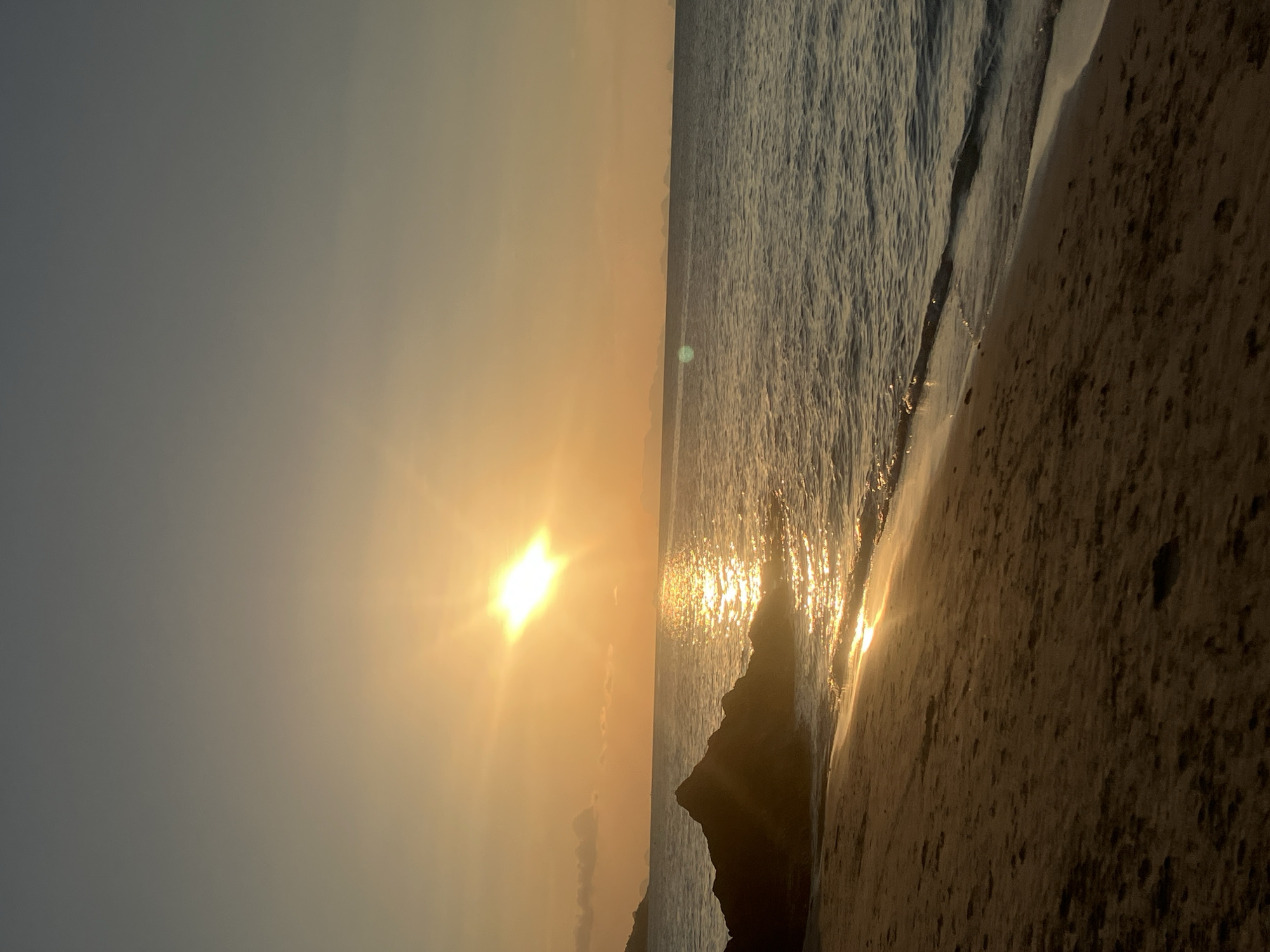 The photograph shows a sunset over the ocean at the beach of Baan Tai, Thailand. The sun is a bright white disc in the center of the image with sun rays radiating outwards. The sky is a gradient of pale yellow to gray in the upper left portion. The ocean is on the right side of the image and reflects the sunlight. The beach sand is on the bottom right of the photo. In the center-right portion of the image, there are dark rocks along the shoreline.