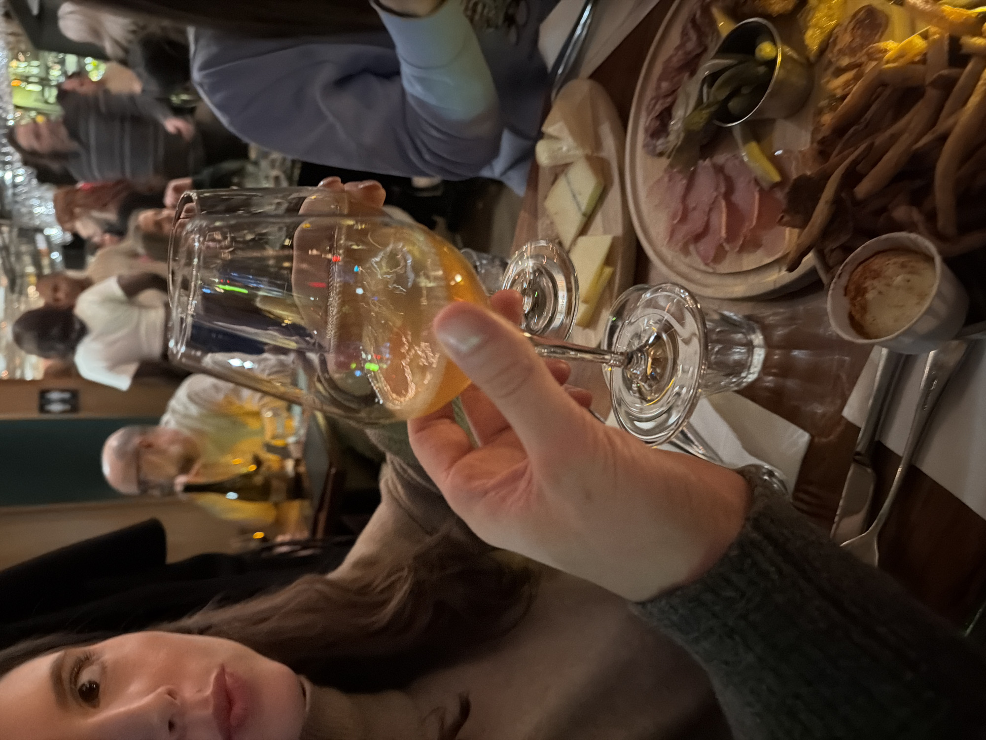 The image depicts the interior of a busy, dimly lit restaurant or bar in Montreal, Canada. In the immediate foreground, a hand with pale skin, wearing a grey knitted sleeve on the wrist, holds a stemmed glass containing an amber-colored beverage. To the left, a portion of a woman's face is visible, with long dark hair and a light brown turtleneck garment. Her eyes are directed upward and to the right. To the right of the glass, a person's arm and shoulder, clad in a light blue long-sleeved top, are partially visible. The central table is dark wood, set with various food items. Two circular wooden serving boards are present. The upper board holds several slices of cheese. The lower board features a charcuterie arrangement, including slices of pink cured ham, darker cured sausage, a small metal ramekin containing green gherkins, and yellow lemon wedges. Adjacent to this, a pile of long, thin, dark-brown breadsticks or similar fried items is present. A small white bowl filled with a creamy dip or spread, topped with red paprika, sits nearby. Silverware (forks and knives) rests on white napkins. A small, clear glass, possibly holding water, is also visible. In the midground and background, numerous individuals populate the space, mostly out of focus. A bald man with glasses, wearing a light-colored long-sleeved shirt, is seated at a table in the mid-left, looking away from the camera. Other patrons, both standing and seated, contribute to a crowded, social atmosphere. Elements of a bar area are discernible, including bottles and hanging glassware. A dark green wall panel is visible on the left. In the upper mid-right, a sign displaying male and female restroom pictograms is affixed to a wall. The overall environment is characterized by warm, dim lighting with scattered bright reflections.