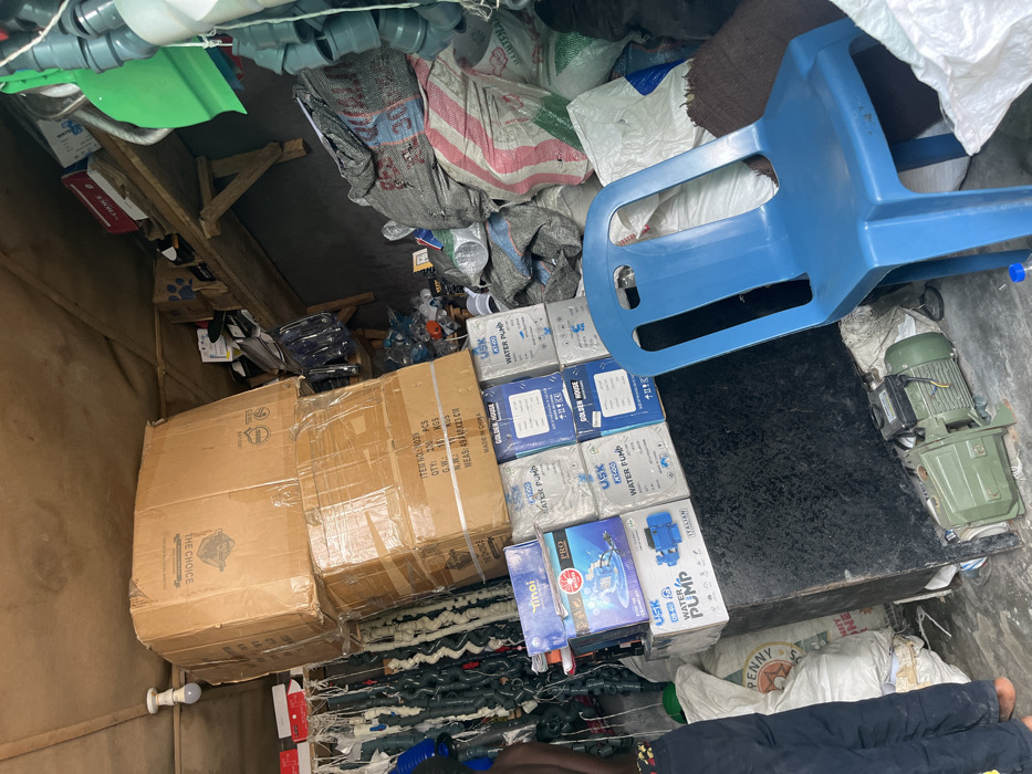 The image depicts the interior of a cluttered storage area or shop in Ojomu, Nigeria