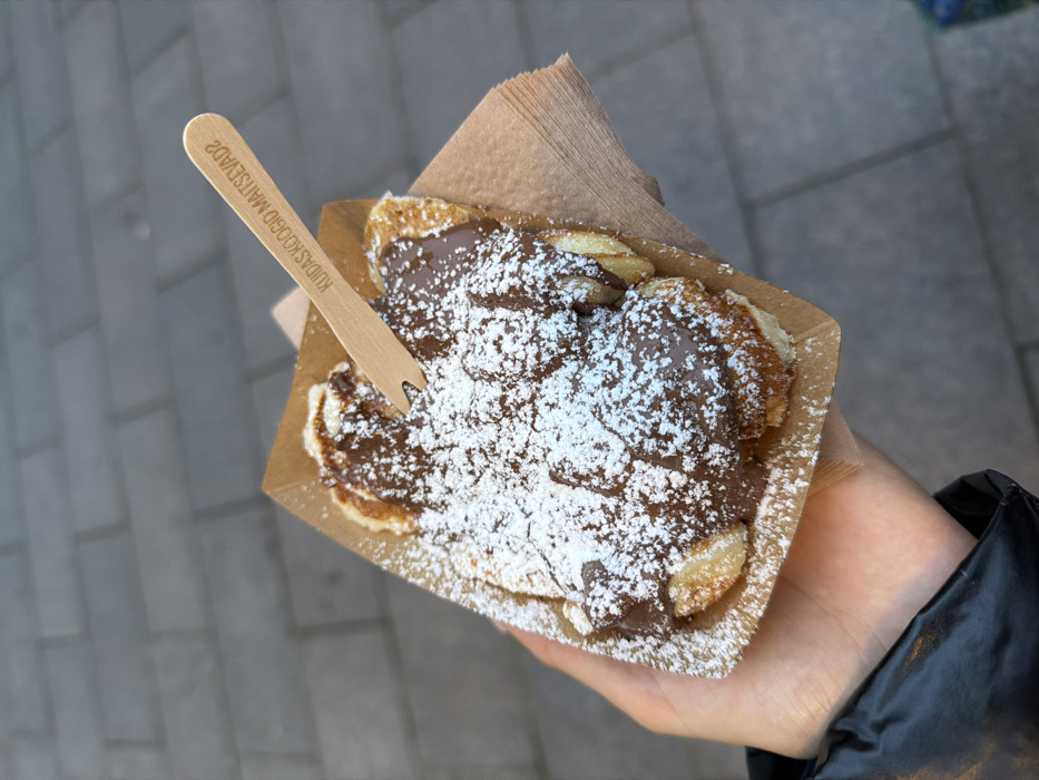 - "A close-up, eye-level view captures a hand holding a rectangular brown cardboard tray containing multiple small, round pancakes, commonly known as poffertjes or Dutch mini-pancakes" by FM-qxt1z2, licensed under CC BY 4.0