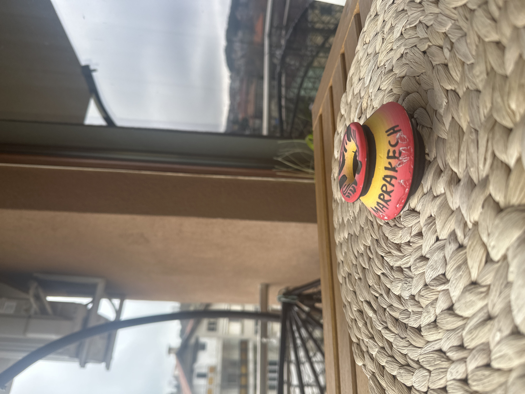 Here is a description of the image: The image shows a souvenir tagine from Marrakech placed on a woven mat. The souvenir is red, yellow, and brown with the word "MARRAKECH" written on it. The woven mat is light brown and has a circular pattern. The picture is taken from a balcony or terrace overlooking a city. In the background, there is a building with large windows and a partial view of a cloudy sky. Considering the context, the location of the image is likely the city of Varna, Bulgaria.