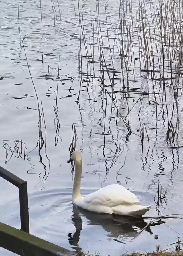 white swan swimming in a lake. Tall, dry reeds are visible in the background, and the water's surface is slightly rippled. A dark metal railing is visible in the foreground along the shore. There are some fallen leaves on the ground nearby. The sky is overcast, and the light is diffused.