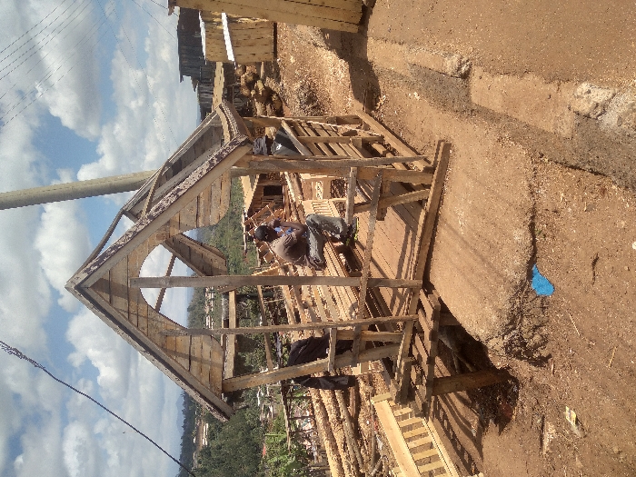 A partially constructed wooden shelter stands on an elevated, uneven dirt platform in Nyeri, Kenya, under a partially cloudy sky