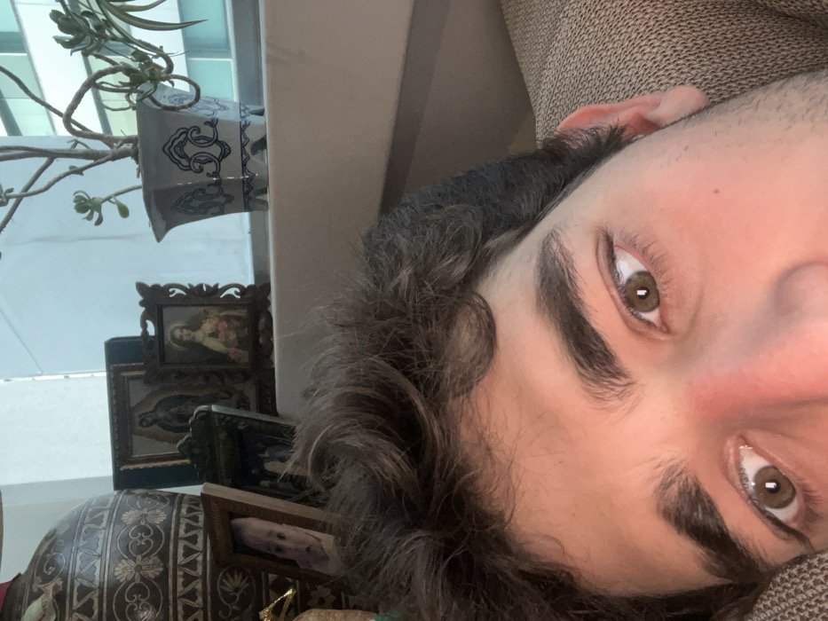 A selfie captures a person's face from a tilted, close-up perspective. They have tan skin, thick dark eyebrows, and hazel eyes that appear to be looking directly into the camera. Soft brown hair with curls frames their face. The background features a window with a plant in a decorative blue and white pot. Small framed pictures and an ornate vase are stacked on a surface below the window. Part of a textured beige surface is visible in the upper right corner.