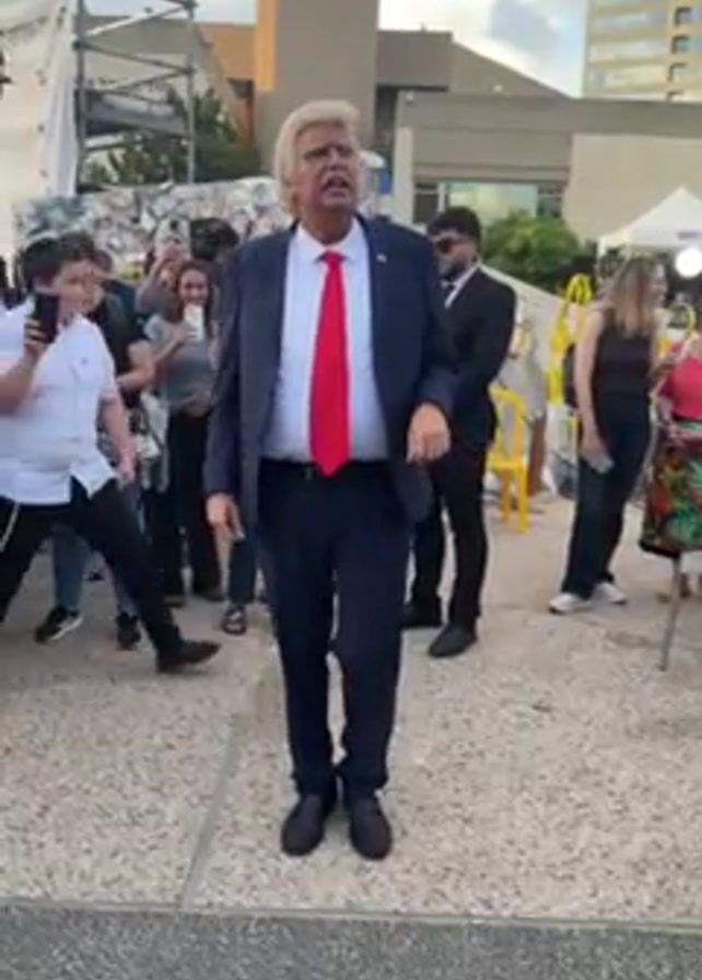 A man dressed as Donald Trump is standing outdoors, surrounded by a crowd of people