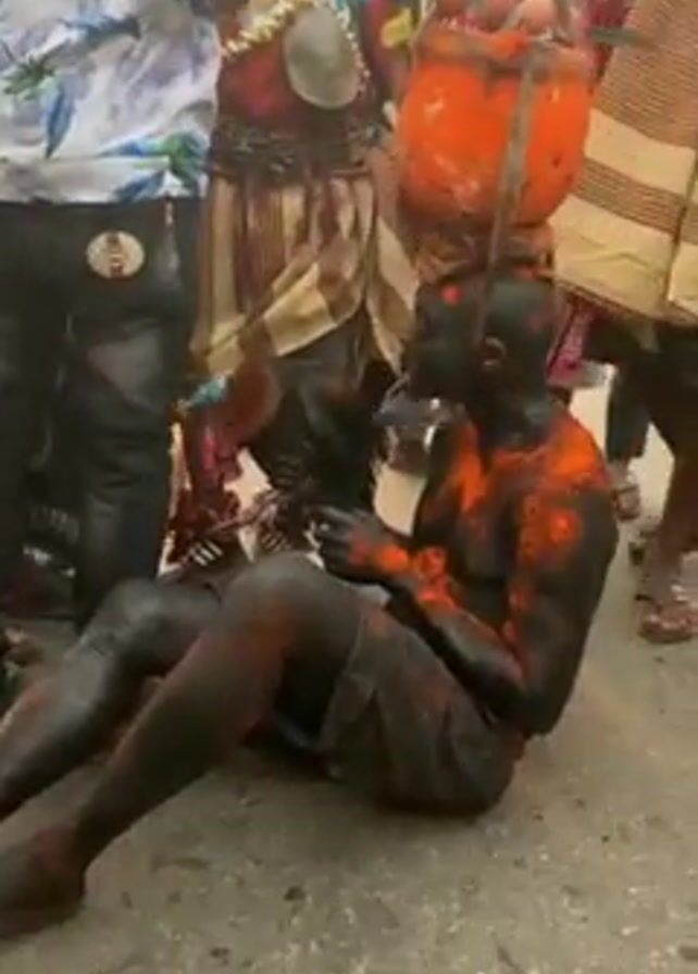 group of people gathered on a paved surface, likely a street. In the foreground, a person covered in black and orange paint sits on the ground. On their head they balance a round, orange container. Several people, some wearing traditional clothing, stand around the seated individual. Some of the people in the background look on. The scene is likely part of a cultural event or performance.