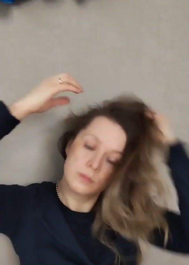 A woman is indoors, facing the camera. She is wearing a dark blue long-sleeved shirt and a gold-colored necklace. She has long, light brown hair and blue eyes. She runs her hands through her hair, lifts it up, then blows air upwards. Behind her is a pale gray wall with inflated blue letter-shaped balloons fixed to it. The camera is at approximately eye level, showing a close-up shot of the woman.