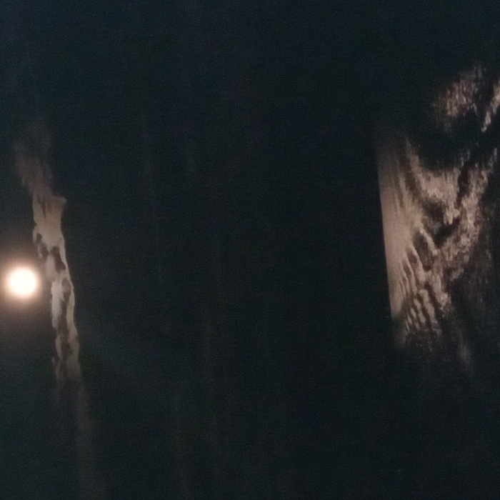 The image depicts a nighttime scene in Unknown, Argentina. A bright, circular full moon is positioned in the upper center, partially obscured by dark, irregular cloud formations. The majority of the sky is dark. In the lower third of the frame, a body of water or a wet, textured surface, possibly a sandy beach or shallow water, is illuminated by a streak of moonlight. This reflection creates a shimmering, wave-like pattern across the surface, extending from the lower right towards the middle-left. No people, man-made objects, or specific actions are visible. The environment is dark and appears to be a natural coastal or open water setting under a cloudy night sky.