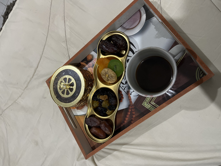 A tray rests on a white surface. It contains a small golden container with an intricate design. Adjacent to it is a three-sectioned gold dish filled with dates, dried fruits including apricots, a kiwi, and raisins. Next to the dish is a grey mug filled with dark coffee. The tray's surface has a patterned design featuring teacups and prayer beads, all enclosed within a brown frame.