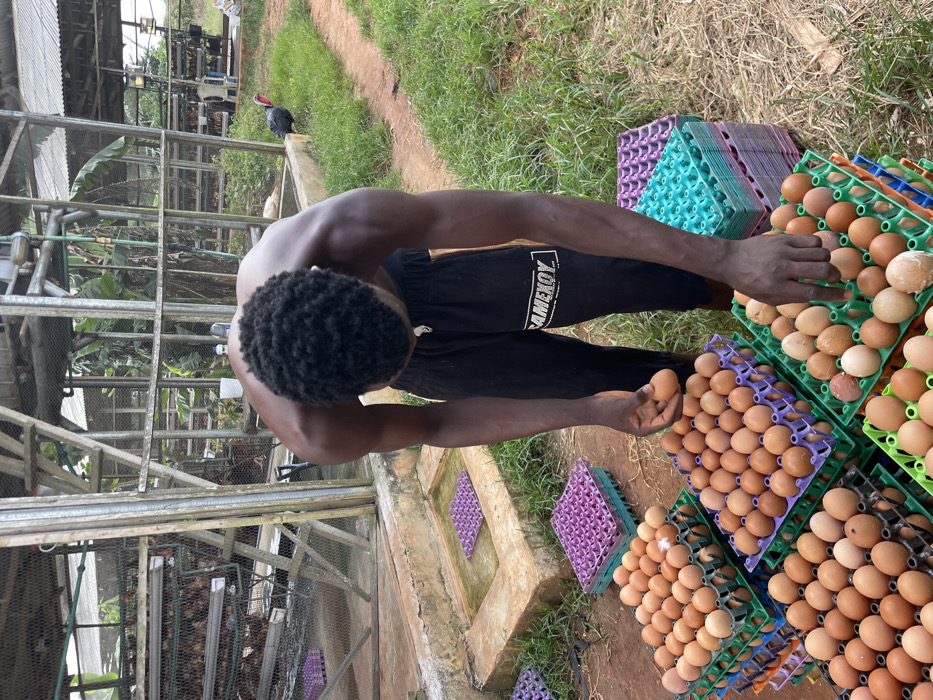 - "A young adult male, shirtless with dark skin and short black hair, is depicted bent over, actively sorting and placing brown eggs into colorful plastic cartons at a poultry farm in Epe, Nigeria" by FM-pK89w1, licensed under CC BY 4.0