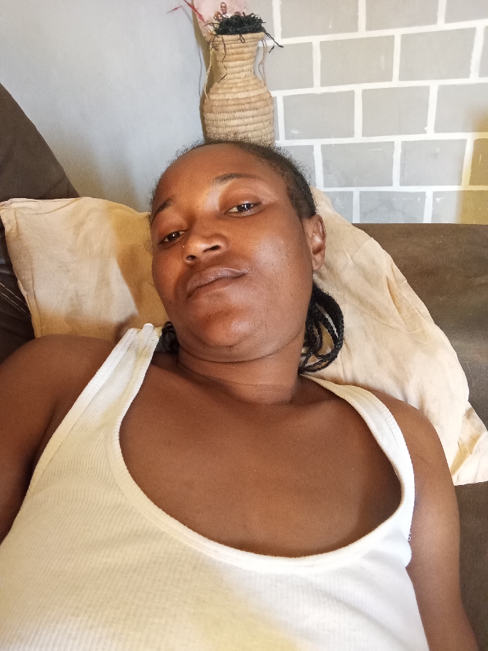 A person with dark skin and braids lies on a brown couch, head propped up on a beige pillow. A white tank top is worn. Behind the person is a wall with gray bricks partially painted white. A woven vase filled with black decorative material sits atop the wall. The lighting is bright.