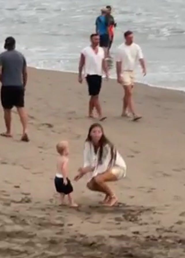 The scene is a beach with light brown sand and a slightly overcast sky. The ocean has moderate waves. Several people are present. In the foreground, a woman in a white shirt and shorts stands facing a small child in black swim trunks. She had been crouched down and talking to the child, and now stands straight. To the left, a man in a dark shirt and dark shorts walks away from them. A small white dog trots next to him. Further back, a group of three men walk along the shoreline; they are wearing shorts and light-colored shirts. In the water, several people are seen swimming or standing. A pair of flip-flops sits on the sand in the lower right corner of the frame.