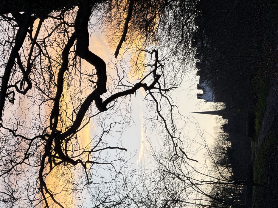 The image depicts a twilight scene over a parkland area in Highgate, North London, United Kingdom, likely within Hampstead Heath or Highgate Wood. The sky displays a gradient of warm orange and yellow hues at the horizon, transitioning to lighter blue and white above. Numerous bare, intricate branches of deciduous trees are silhouetted against this sky, dominating the upper and left portions of the frame. A narrow, unpaved dirt path winds through dark ground foliage and further silhouetted trees and bushes in the foreground. In the midground, a prominent, slender church spire, identified as St Michael's Church, Highgate, rises above the distant tree line. To the right of the spire, a large, multi-story building, consistent with structures found within the Holly Lodge Estate, is partially visible, characterized by a lighter upper facade, reddish lower sections, and multiple distinct chimneys along its roofline. The scene is devoid of human presence or overt activity, characterized by strong backlighting that creates deep silhouettes of all natural and architectural elements.