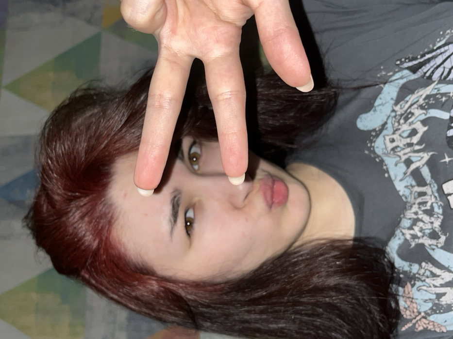 A young individual, identified as being in Starobaltachevo, Russia, is depicted in a close-up, chest-up portrait. The subject, a female with medium skin tone, dark hair featuring reddish highlights around the scalp, and light brown eyes, faces the camera directly. Her lips are puckered into a pout. Her right hand is raised, forming a V-sign (peace sign) with the index and middle fingers extended; the index finger crosses her forehead, and the middle finger crosses the upper part of her right eye. Several minor blemishes are visible on her forehead and cheeks. She wears a dark gray t-shirt with a light blue and white graphic print, partially visible, which includes elements resembling skeletal designs and text, with "BAD VIBES" discernible. The background consists of a wall adorned with a geometric pattern of multicolored triangles in shades of blue, green, yellow, and gray.