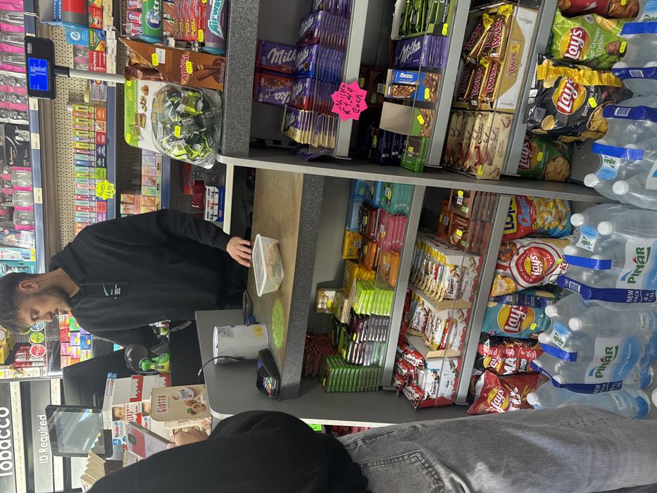 The scene is a convenience store located in Cambridge, United Kingdom, at the coordinates 52.201 latitude and 0.134 longitude. There are two people in the store. A young man, wearing a black hoodie and jeans, is standing at the counter, presumably making a purchase. Another individual, possibly a customer or employee, is partially obscured by the counter and is facing away from the camera. The man at the counter appears to be holding a cash payment. A variety of items are on shelves behind the counter, including chocolate bars, candy, potato chips, and water bottles. The floor is tiled and the walls are painted white. There are several shelves filled with merchandise on the right side of the image, as well as a sign on the wall that reads "Tobacco, ID Required." There are also shelves on the left side of the image with several items of merchandise. A digital display above the shelves shows the date and time. The overall scene is a typical convenience store with a customer making a transaction.