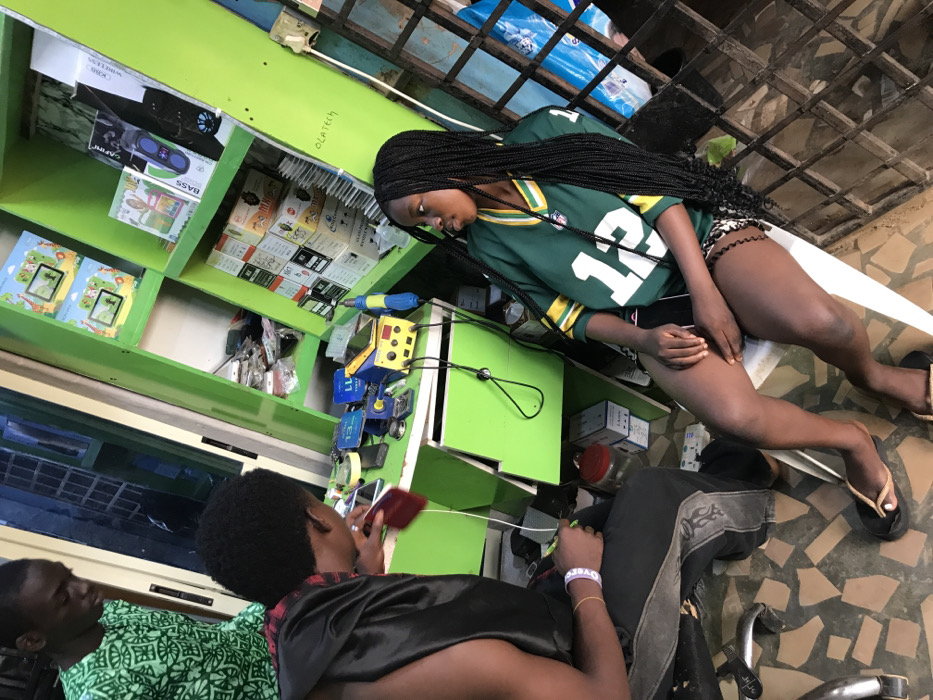 This image depicts an indoor scene within an electronics and phone repair shop in Ijoko, Nigeria