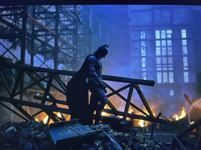 Batman stands atop rubble amidst flames