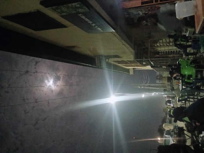 This image depicts a nighttime street scene in Mumbwa, Zambia. The sky is dark and cloudy, revealing a partially obscured moon and multiple overhead power lines. Artificial light sources, including streetlights, illuminate the scene; a prominent streetlight in the mid-left creates a significant lens flare. On the right, a light-colored, multi-story building features dark rectangular windows and a sign reading "TIMES N' MOVIES" on its facade. A metal cage structure is visible at the building's ground level. Along the street, utility poles with power lines extend into the background. In the foreground and midground, an outdoor seating area is present, furnished with small tables and an assortment of plastic chairs, some green, some dark. Approximately 10-15 individuals are dispersed throughout the scene. Several people are seated at tables, engaged in various activities such as conversing or using mobile devices. A person in a light-colored shirt stands on the far right, partially obscured by a white container resting on a wooden surface. Further down the street, additional individuals and at least one light-colored vehicle are visible.
