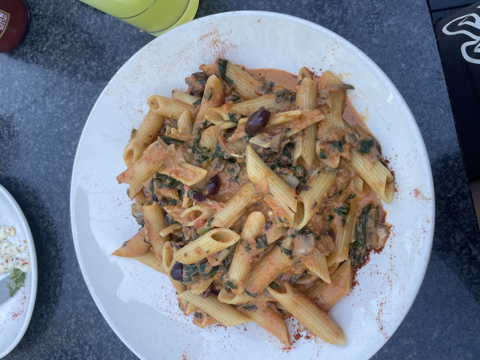 A white, slightly oval plate containing a serving of penne pasta is centrally positioned on a dark grey, speckled table surface. The pasta is coated in a creamy, reddish-orange sauce and includes visible ingredients such as green leafy vegetables (spinach), whole black olives, and sliced mushrooms. The rim of the plate is lightly dusted with a reddish-orange spice. In the upper left background, a portion of another white plate shows remnants of a light-colored, partially consumed dish containing corn kernels. To the upper right, a translucent yellow-green glass or bottle with a light-colored beverage is visible. A dark fabric object with a white design is partially visible in the lower right corner of the frame. The scene is located in the city of Germiston, South Africa.
