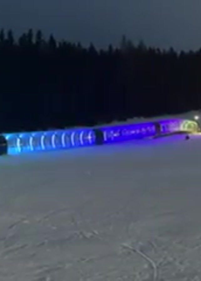 winter sports area at night. A snow-covered slope is illuminated by streetlights and a long tunnel made of connected, translucent sections. The sections of the tunnel cycle through various colors, including blue, green, yellow, red, and purple. The edge of a snowboard with a cartoon logo is visible in the foreground. Several figures can be seen scattered on the slope near the tunnel exit. A dark treeline is silhouetted against the night sky.