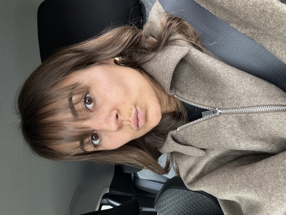 A female individual is depicted in a close-up portrait, occupying the majority of the frame, inside a vehicle in Mougins, France. She has brown hair with bangs and wavy shoulder-length strands, and brown eyes. Her lips are puckered in a "kissing" gesture, and she looks directly at the camera. She wears a light brown or taupe-colored collared jacket, partially open, with a prominent silver zipper. A dark garment is visible underneath the jacket. A gold-colored hoop earring is present on her visible right ear. A dark gray vehicle seatbelt diagonally crosses her chest and shoulder. The background reveals portions of a vehicle interior, including dark-colored car seats, one with a quilted pattern on the headrest.