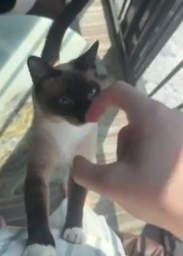 brown and white Siamese cat standing on someone's lap near a balcony. The person holds up a hand and makes clicking noises. The cat raises its paw to the person's hand. The person continues to make clicking noises, and the cat sniffs the hand. The balcony railing is visible, with sunlight streaming through the slats. There is a small table and a cat tree in the background.