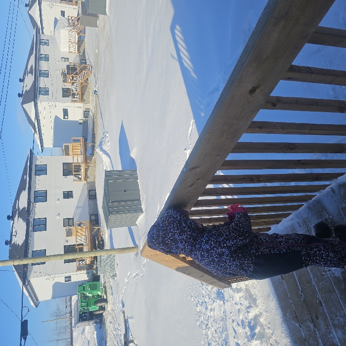 A child in a floral-patterned snowsuit and pink hat stands on a wooden deck with a railing. Beyond the deck is a snowy landscape with a stack of metal panels. New, modern townhouses are visible in the background, along with a green construction vehicle. The sky is blue and clear, with power lines visible on the left.