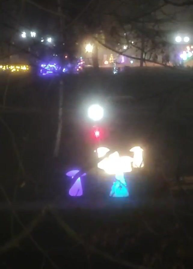 dimly lit park at night. In the foreground, there are three illuminated mushroom decorations, one purple, one yellow and white, and one that cycles through colors. In the background, there are other light displays, with various colors and patterns, scattered throughout the park. The camera is stationary. Branches are visible in the foreground.