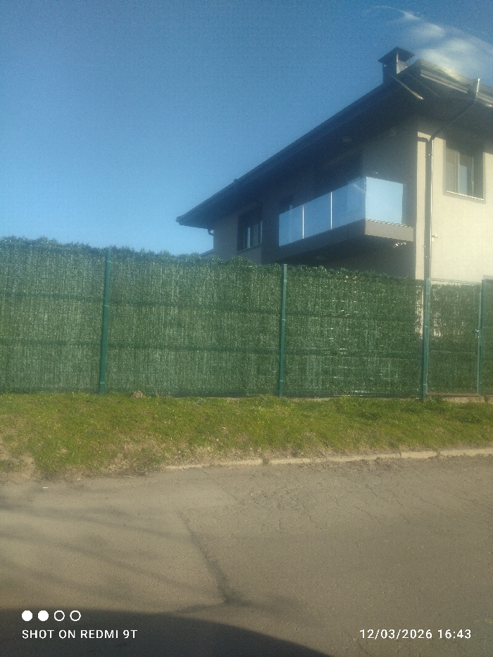 The image depicts a residential property in Mirovyane, Bulgaria, observed from a paved road on March 12, 2026, at approximately 16:43. The scene is dominated by a two-story, light-beige colored house with a dark-tiled, sloped roof. A modern balcony with a clear glass railing system extends from the second floor, reflecting the clear blue sky. A dark-colored chimney is visible on the right side of the roof. The property is separated from the foreground by a green artificial hedge screen, approximately 2 meters high, secured to vertical green metal posts. A section of this screen on the far right appears to be part of a gate. In front of the fence, a strip of sparse green grass borders the asphalt road, which occupies the lower third of the frame. The road surface shows minor cracks and shadows are cast across it, originating from the left. The sky overhead is clear and blue, with minimal cloud cover visible in the upper right quadrant. No individuals, vehicles, or animals are present.