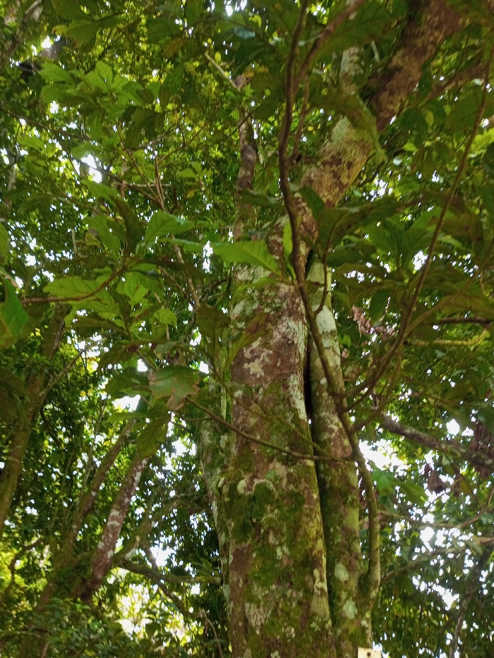 The image displays a low-angle perspective looking upward into a dense tree canopy within the city of New Serchhip, India. A prominent tree trunk, heavily covered with green moss and lighter patches of bark, occupies the central and right portions of the foreground. This trunk appears to be composed of two closely intertwined or vertically split sections. Numerous branches, adorned with broad, green leaves, extend throughout the frame, creating a natural overhead canopy. Bright spots of sunlight filter through the foliage, indicating an outdoor, daytime setting. No individuals, animals, or man-made objects are visible, establishing a purely arboreal environment.