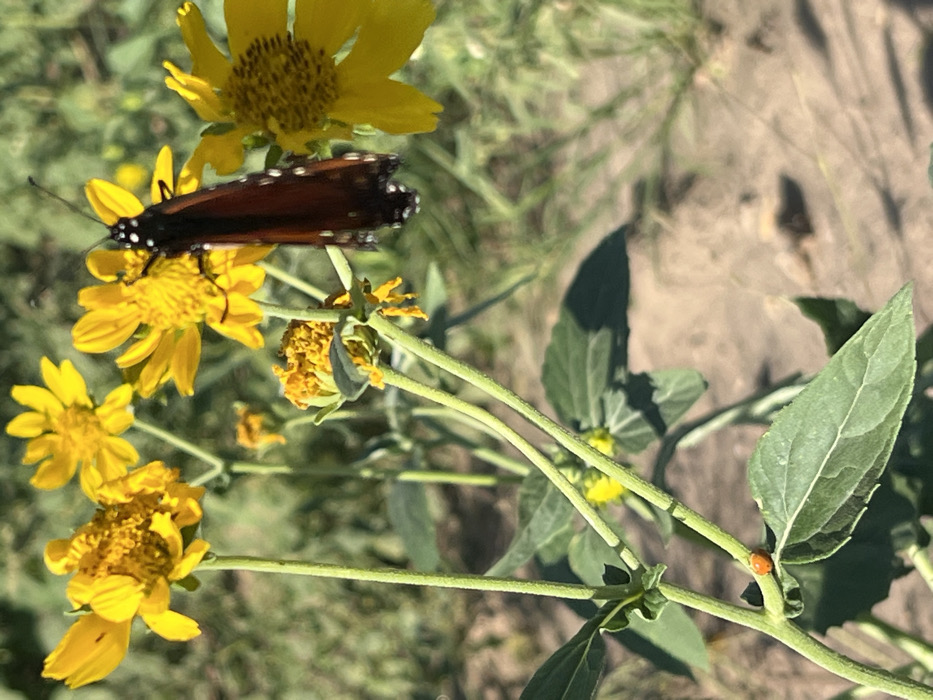 The image displays an outdoor scene in San Fernando del Valle de Catamarca, Argentina. A butterfly, predominantly dark orange-brown with white spots along the edges of its closed wings and thorax, is perched vertically on the yellow floral disc of a bloom located in the upper right. Multiple similar yellow flowers, some fully open and others appearing as buds or partially withered, are supported by slender green stems. A small, round, orange ladybug is visible on a lower green stem to the left, situated above a broad green leaf. The immediate background and lower right show blurred light brown earth or sand, interspersed with indistinct green vegetation. The scene is illuminated by natural light.
