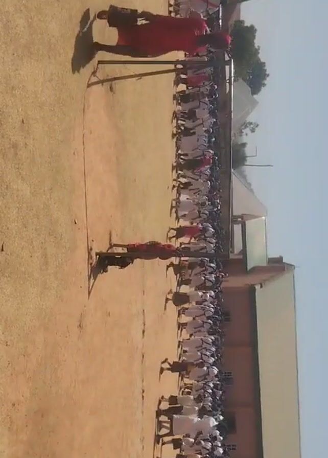 large group of people, mostly wearing white uniforms, standing in formation on a dirt field. Two individuals dressed in red are performing some sort of routine with thin poles. One of the people is wearing a plaid shirt. The field appears to be a schoolyard or similar space, with a building visible in the background. The sky is clear and blue.