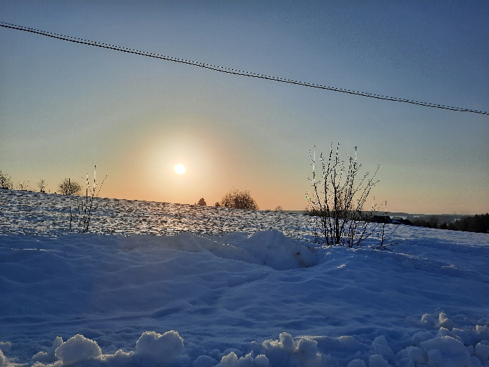 The image depicts a snow-covered landscape under a clear sky, consistent with a rural or semi-rural setting in Архангельское, Russia. The sun, a bright, circular, yellowish orb, is low in the sky, positioned slightly to the left of the image's center, indicating either sunrise or sunset. The sky transitions from a pale blue at the zenith to a warm yellow-orange hue near the horizon. The ground is entirely covered in white snow, displaying an undulating, uneven texture with distinct clumps and a larger snowdrift in the foreground to the left. A bare-branched shrub or small tree stands in the midground to the right, its thin branches possibly coated in frost or ice, catching the sunlight. Additional bare trees are visible on a gentle rise in the distant left and silhouetted against the sun's glow to the right. A dark, thin utility wire spans horizontally across the upper portion of the sky. No individuals or animals are present.