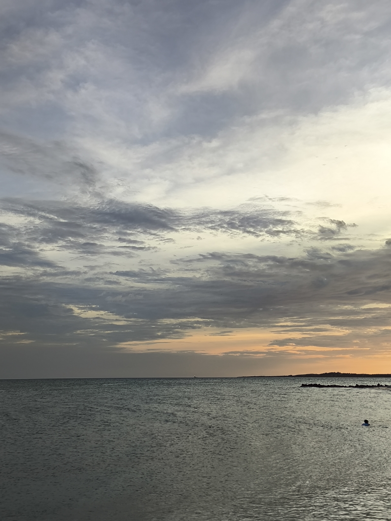 The image depicts a seascape under a cloudy sky, likely at sunset, in El Yaque, Venezuela. The sky is predominantly gray with tinges of orange near the horizon, suggesting the time of day. Below the horizon, a body of water, possibly the Caribbean Sea, stretches out. In the distance, land is visible with a rocky structure extending into the water. A person is swimming in the water, relatively close to the foreground. The scene conveys a sense of tranquility and the natural beauty of the coastal location.