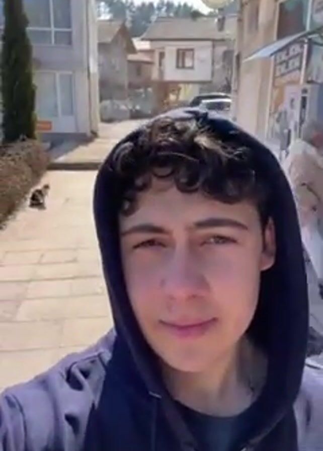 A young man with curly brown hair and a blue hoodie is recording a video selfie outdoors. Behind him, there is a building with flags and a sign in a Cyrillic script. To the side, a supermarket sign is visible. A person feeds a dog in the background. The setting appears to be a small town on a sunny day.