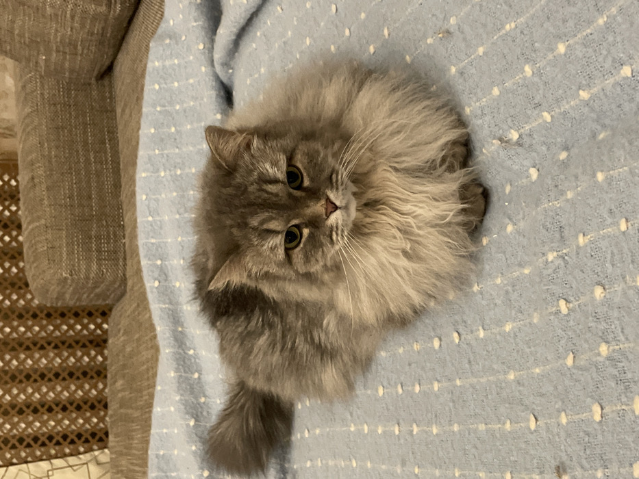 - "A long-haired, predominantly gray and silver cat with amber-green eyes, a pink nose, and long white whiskers is depicted lying on a light blue blanket with a white dotted pattern" by FM-SkaCf1, licensed under CC BY 4.0