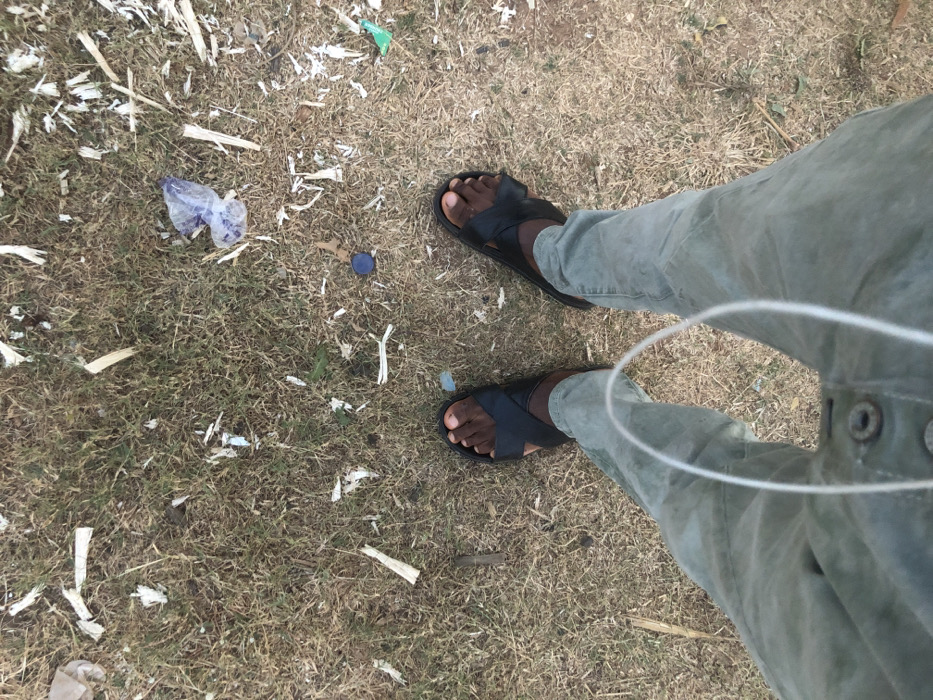 A person wearing grey jeans and black sandals stands on dry grass covered with trash