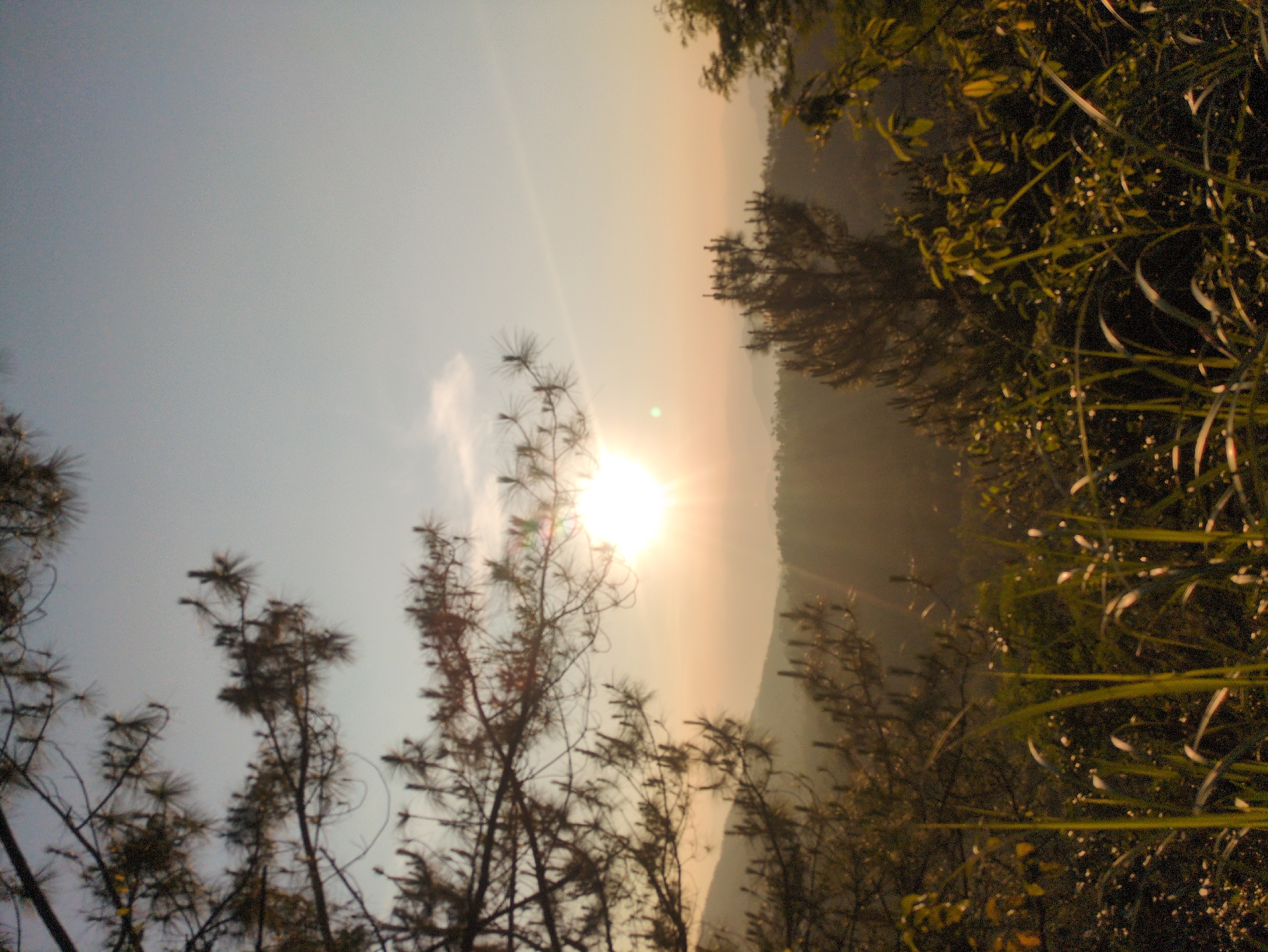 The image depicts a panoramic natural landscape at either sunrise or sunset, observed from an elevated position in South Quy Nhon Ward, Vietnam. The sun, a brilliant white-yellow orb with distinct rays, is prominent slightly left of the frame's vertical center, low on the horizon, illuminating the scene from behind. The sky above transitions from a clear, light blue at the top to warm yellow and orange hues around the sun. A small, indistinct white cloud is present in the upper-left quadrant. In the foreground, the bottom half of the image is filled with various foliage, including prominent, elongated blades of grass partially lit by the sun, and darker, dense undergrowth. Silhouetted branches of coniferous trees with needle-like leaves extend into the frame from the left and top-left, obscuring parts of the sky and distant view. The midground and background consist of multiple layers of receding mountains or hills, appearing hazy and progressively darker due to atmospheric perspective and backlighting. Additional coniferous trees are visible on closer hillsides, partially silhouetted against the bright horizon. No human figures, structures, or man-made objects are discernible. The scene is static, capturing a natural vista under warm, diffused light.