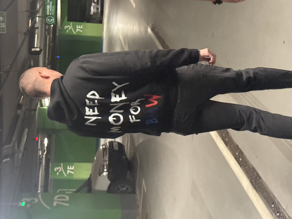 A male subject is observed from behind, walking away from the camera in an underground parking garage located in Sofia, Bulgaria. He has short, light-colored hair and wears a black hooded sweatshirt. The back of the sweatshirt features white, hand-painted text that reads "NEED MONEY FOR", with "BMW" written underneath in blue, light blue/white, and red, mimicking the brand's logo colors. He is also wearing dark trousers. The environment is a concrete parking garage with green-painted pillars and walls. The floor is light gray concrete with white painted lines marking parking spaces and pathways. A metal drainage grate runs parallel to the subject's path on the left. Overhead lighting fixtures are visible on the ceiling. Pillars are marked with numerical and alphabetical identifiers such as "7D" and "-3 7E". In the background, illuminated green signs with directional arrows and Cyrillic text, including "ИЗХОД" (EXIT), are visible on the ceiling, indicating navigation. A white and dark-colored hatchback vehicle is partially visible parked behind a pillar on the left, and another dark vehicle is partially visible further in the background on the right.